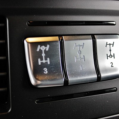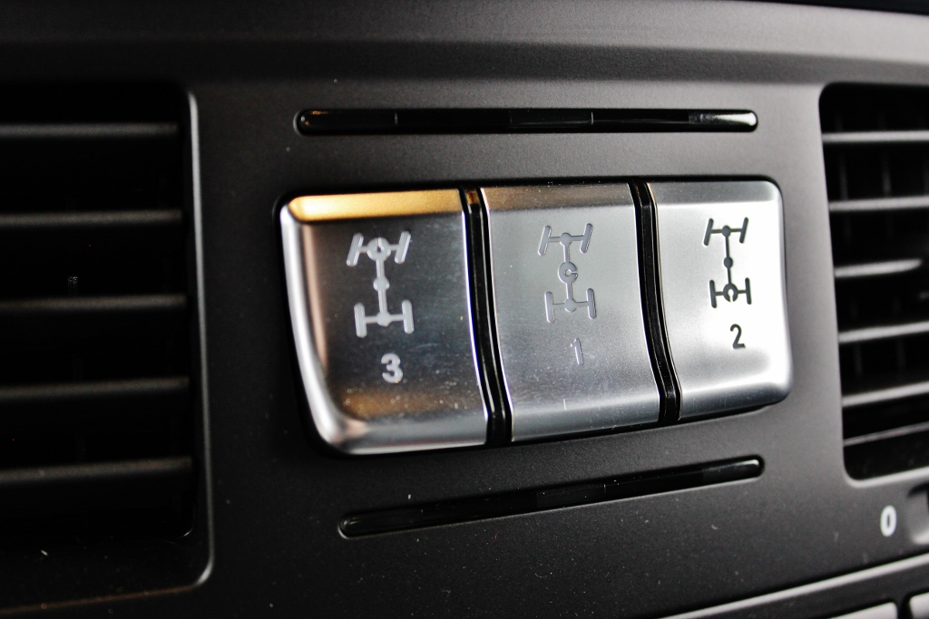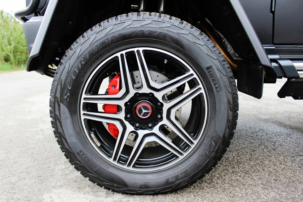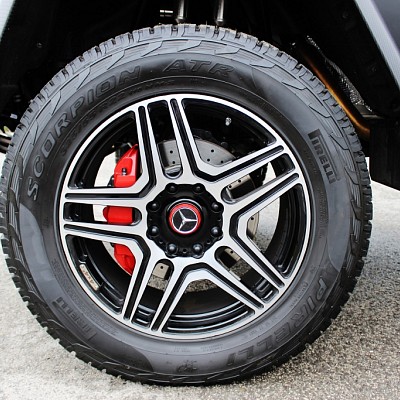 Každé z kolies je odpružené dvojicou pružín a tlmičov. Kým jeden pár je klasický, druhý mení tuhosť pruženia, a to len za skvelých 15 milisekúnd. G500-ka sa tak dokáže prispôsobiť nielen terénu, ale aj asfaltu. Nastaviť si môžete nastaviť dva módy, Comfort a Sport. Prvý spomínaný je vhodnejší do terénu a mód Sport na bežné asfaltové cesty. Je tu však ešte jedna vychytávka -pri jazde na piesku dokáže G500 4×4² znížiť tlak v pneumatikách až na 0,5 baru, čo znamená väčšiu styčnú plochu so sypkým povrchom, ľudovo povedané, stlačením tlačidla si viete pneumatiky sfúknuť a zas späť nafúknuť. Pýtate sa, či takýto manéver znesú disky? Áno, sú totiž dvojdielne a skonštruované presne na tento účel. Prekvapilo nás ich detailné spracovanie, s emblémom 4×4² na ráfikoch.