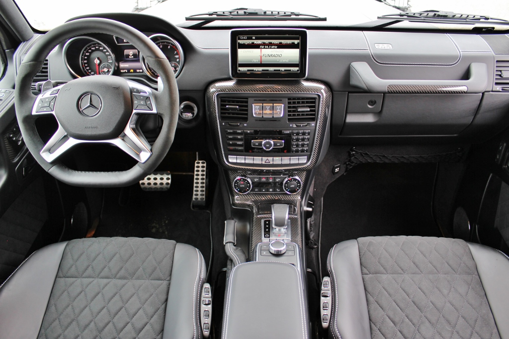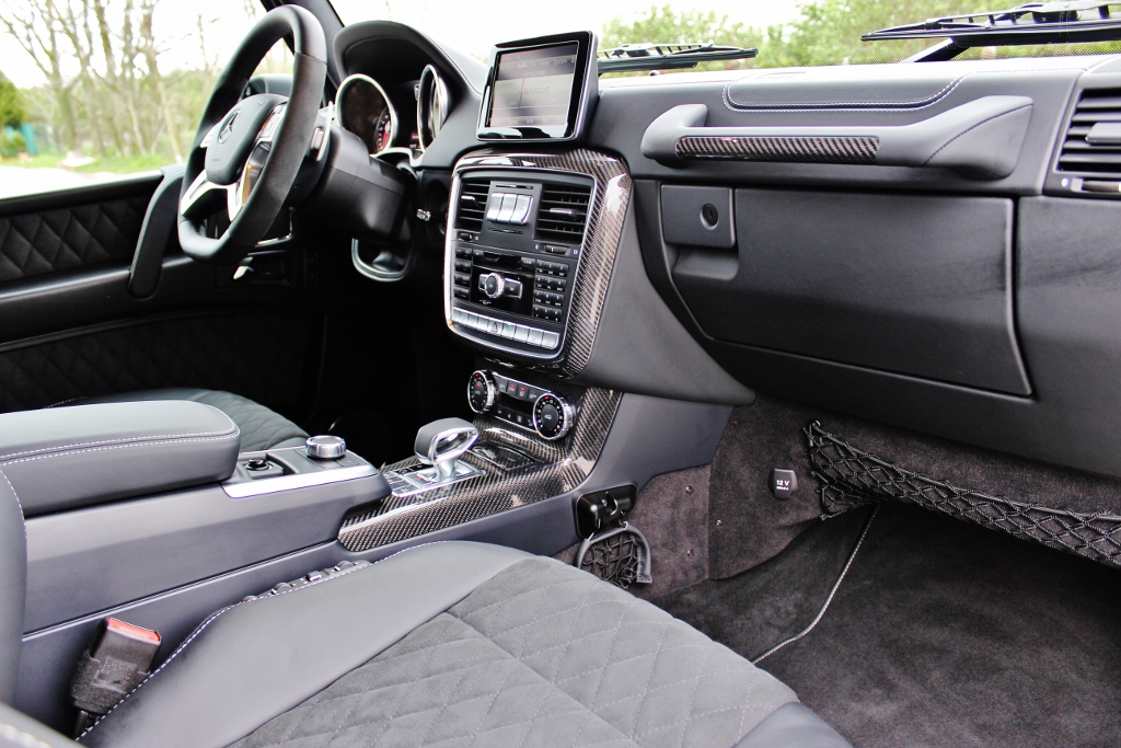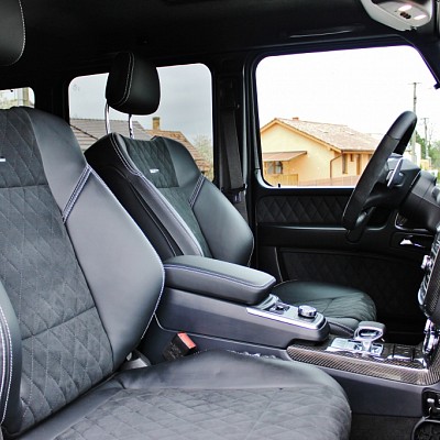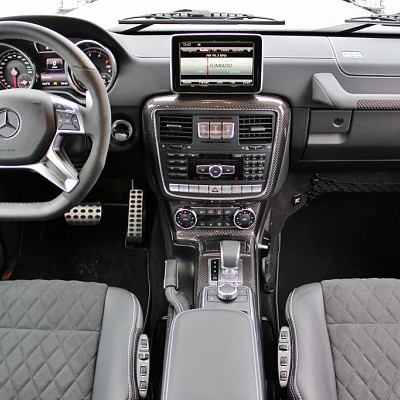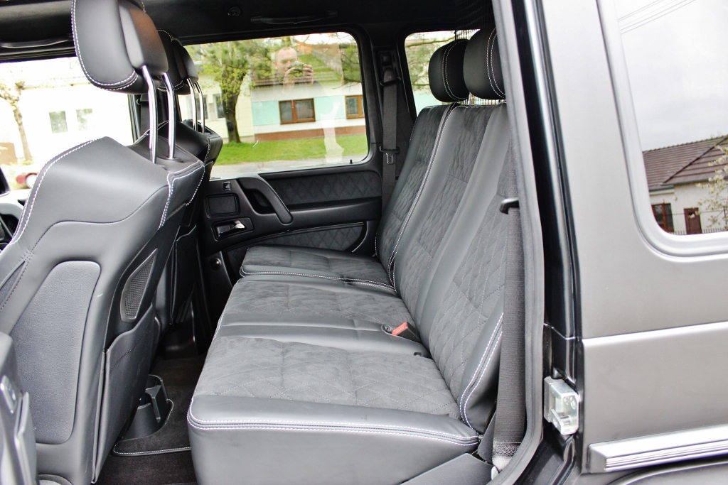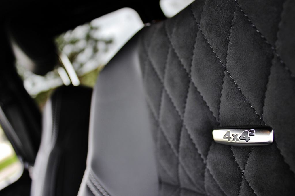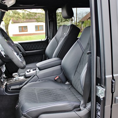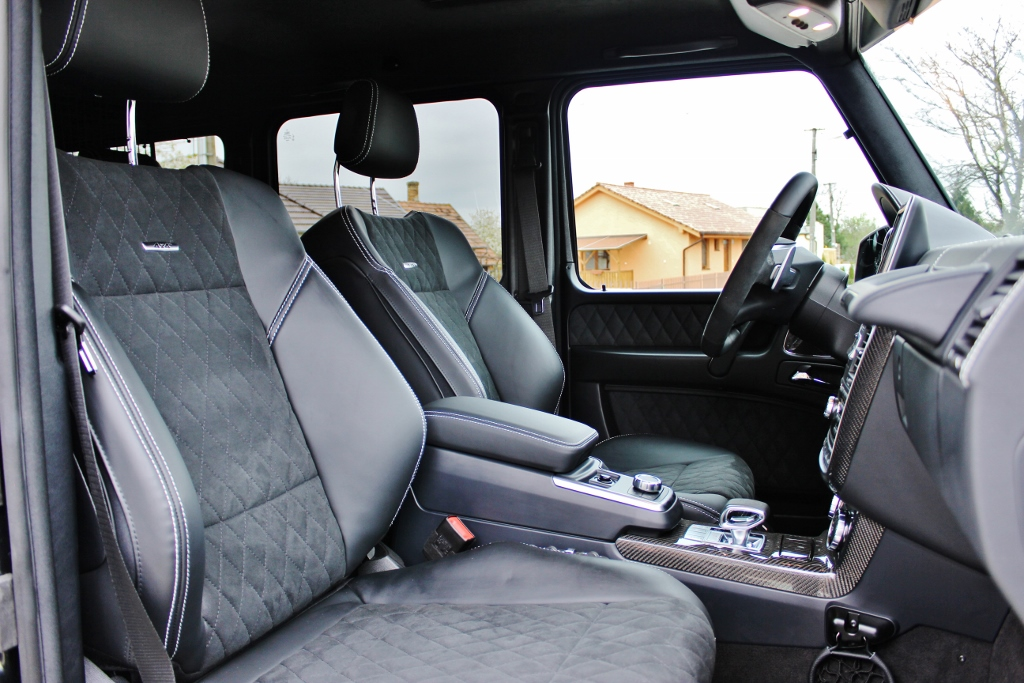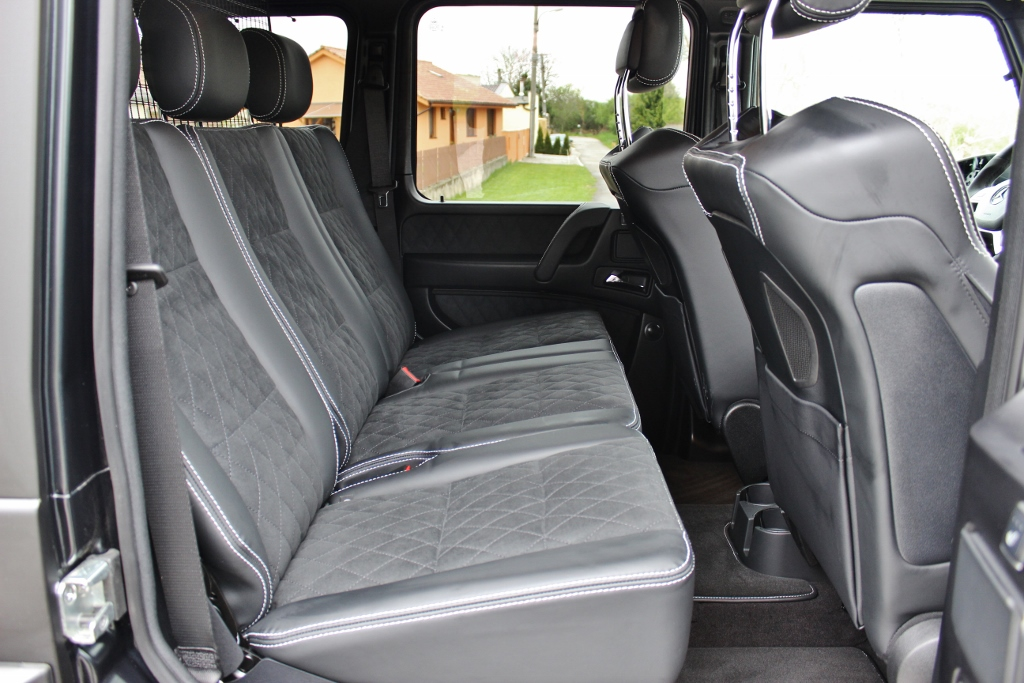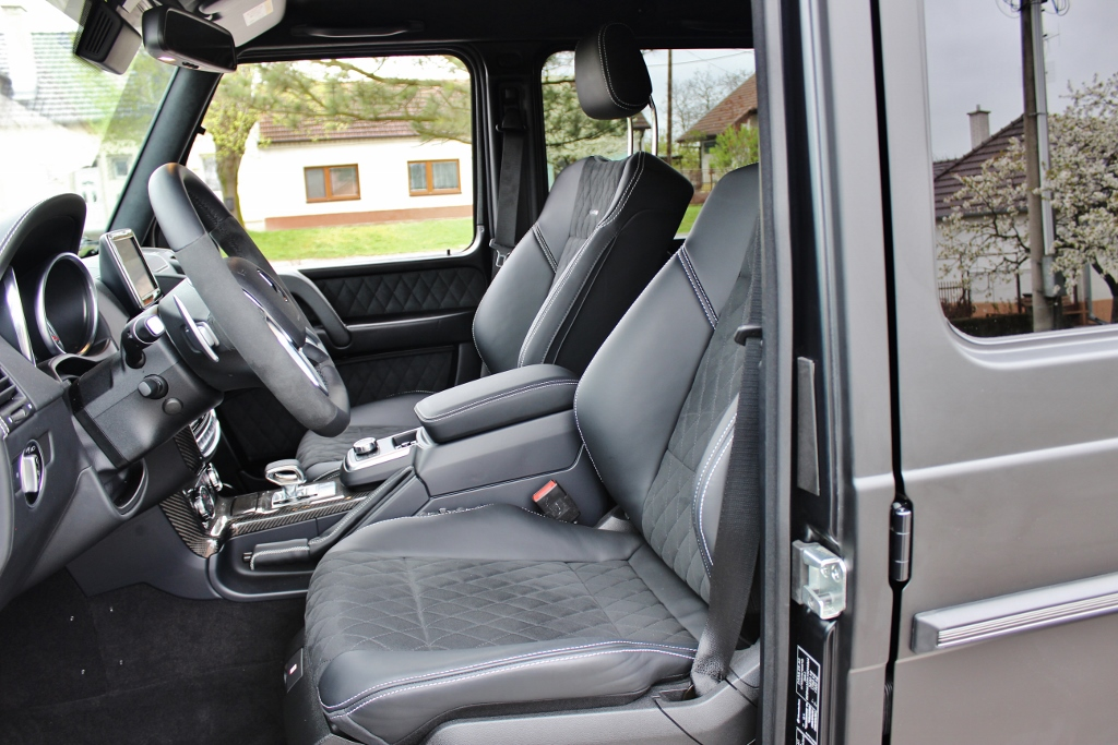 Interiér je do bodky prepracovaný, ako sme už u týchto áut zvyknutí, sedadlá zdobia drobné „visačky“ s logom 4×4² a na hlavici radiacej páky, ktorá je až minimalistická, vyniká vystúpené logo AMG. Bielou niťou ručne prešívaná palubná doska v koži, či efektné prešívanie sedadiel rovnakou niťou dodávajú interiéru správny šmrnc. Do toho stropnica v brúsenej koži a každý fajnšmeker je na vrchole blaha. Trošku nás prekvapilo, že pri množstve elektroniky sme našli v interiéri úplne bežnú a obyčajnú manuálnu ručnú brzdu. Tiež sme boli trošku sklamaní miestom na zadných sedadlách, kde si za vysokého šoféra už ďalšia vyššia osoba nesadne, resp. sadne len s problémami.