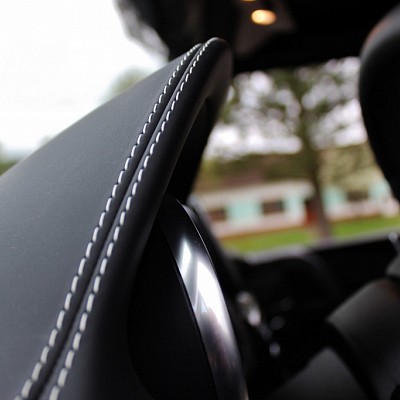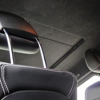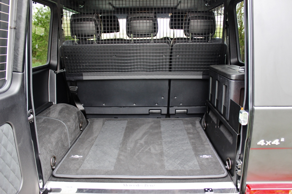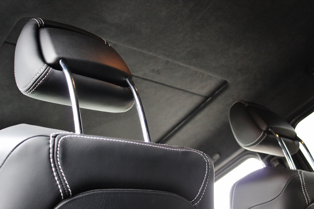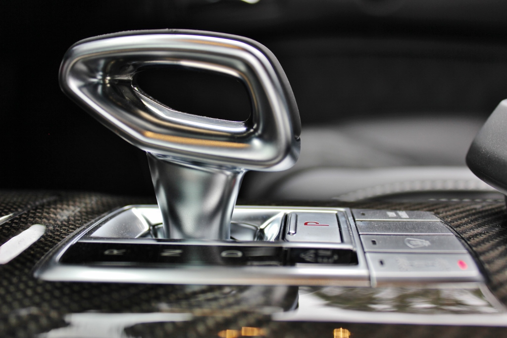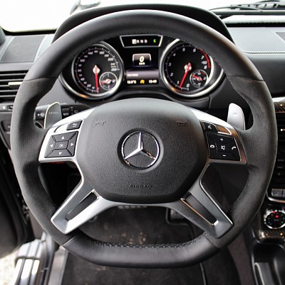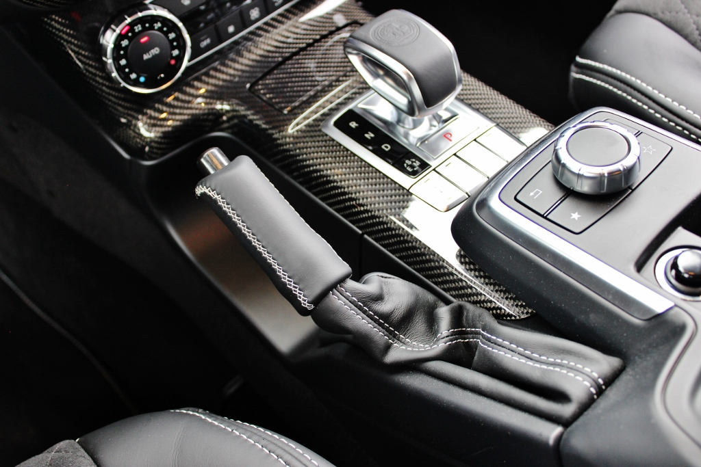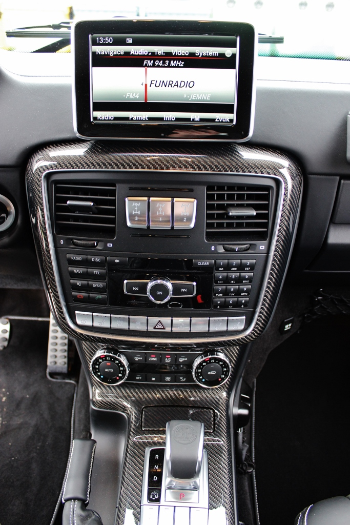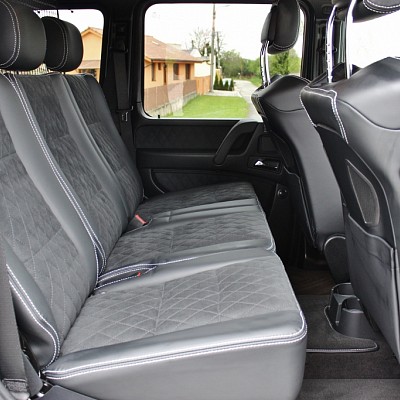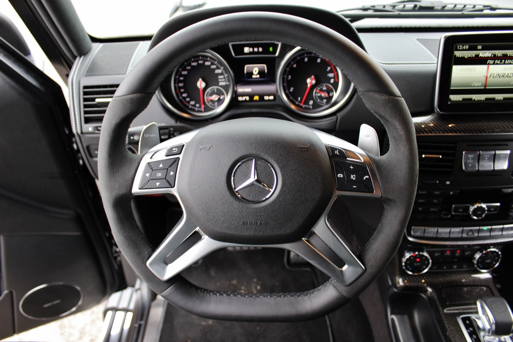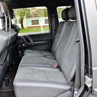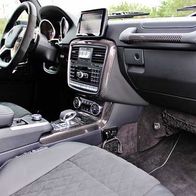 Interiér je do bodky prepracovaný, ako sme už u týchto áut zvyknutí, sedadlá zdobia drobné „visačky“ s logom 4×4² a na hlavici radiacej páky, ktorá je až minimalistická, vyniká vystúpené logo AMG. Bielou niťou ručne prešívaná palubná doska v koži, či efektné prešívanie sedadiel rovnakou niťou dodávajú interiéru správny šmrnc. Do toho stropnica v brúsenej koži a každý fajnšmeker je na vrchole blaha. Trošku nás prekvapilo, že pri množstve elektroniky sme našli v interiéri úplne bežnú a obyčajnú manuálnu ručnú brzdu. Tiež sme boli trošku sklamaní miestom na zadných sedadlách, kde si za vysokého šoféra už ďalšia vyššia osoba nesadne, resp. sadne len s problémami.