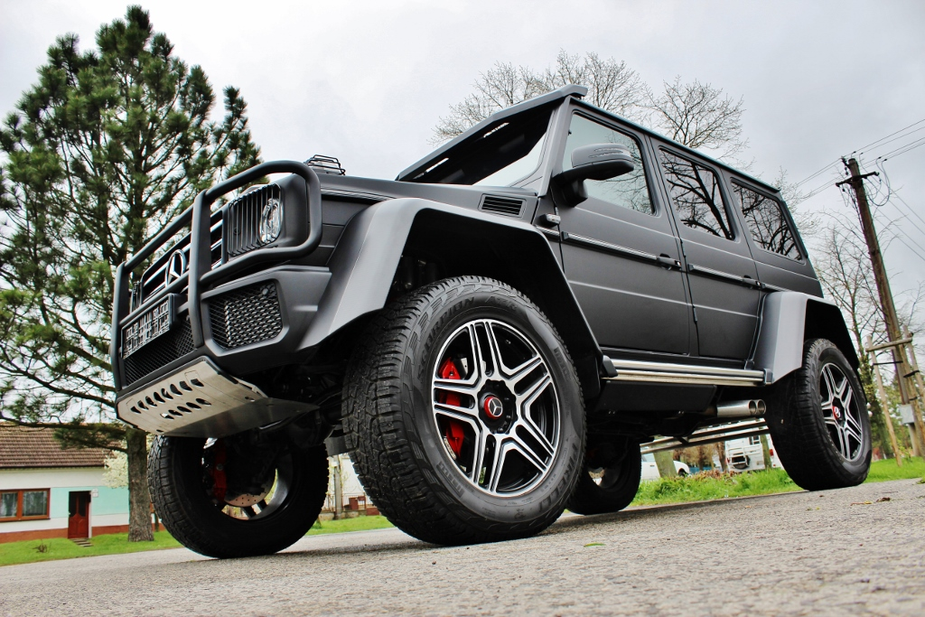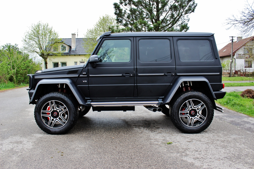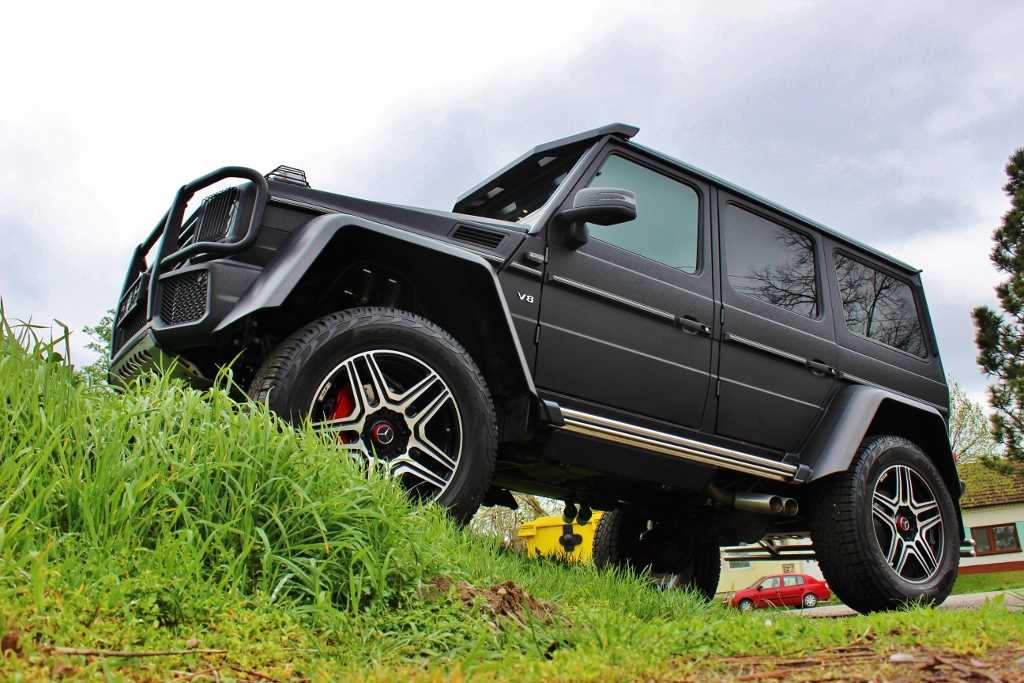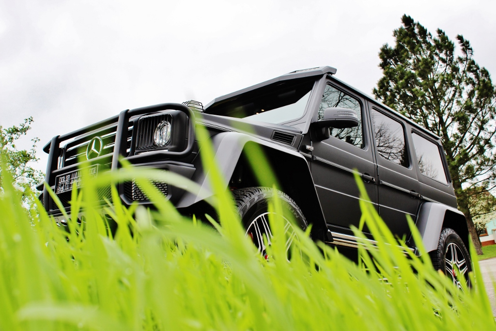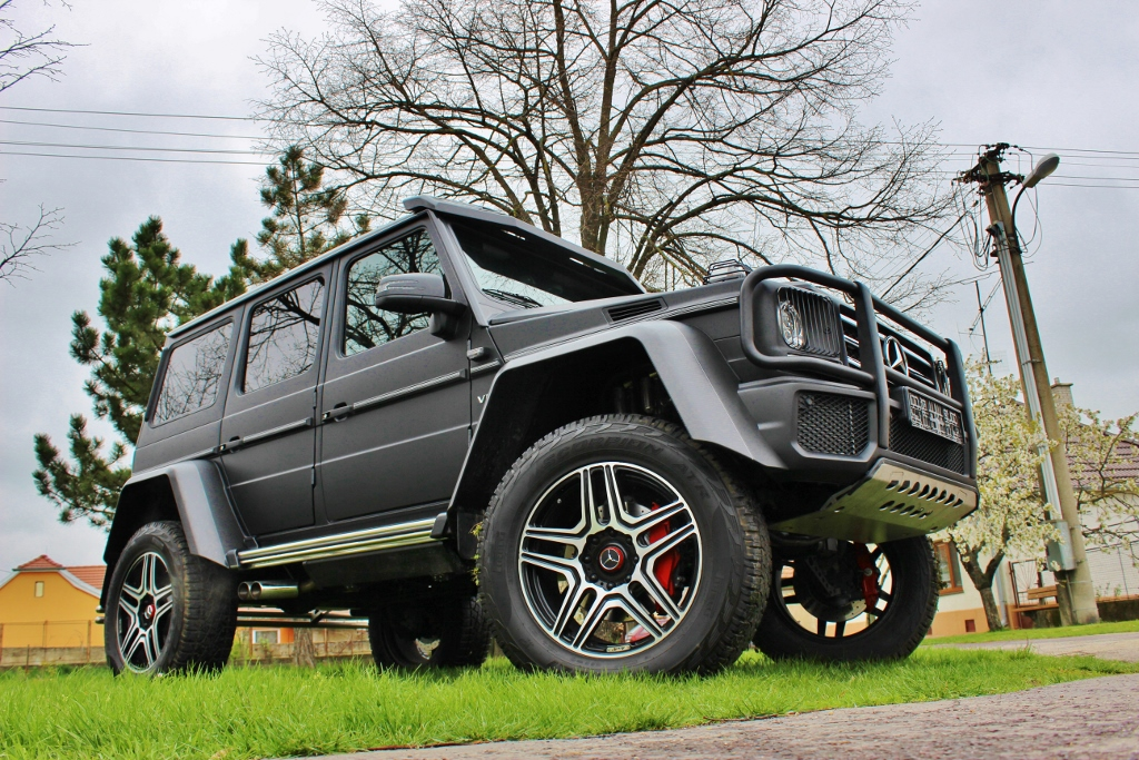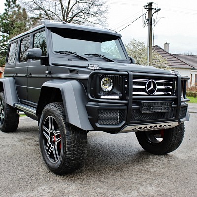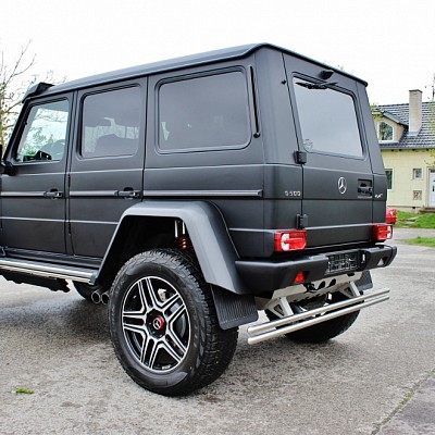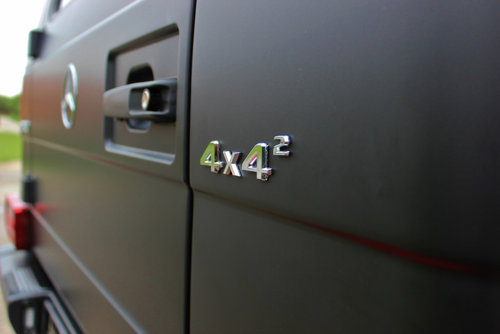 A teraz náš tím na čele so skvelým profíkom Peťom Bártom, opäť oblepoval do čiernej matnej fólie, jeho nástupcu, pomenovaného originálne, Mercedes G 4x4 na druhú. Nami testovaný štvorliter s dvoma turbami a ôsmimi valcami nás uchvátil od samotného začiatku. Už výkon 310 kw (420koní) a zrýchlenie z nula na stovku za 5,9 sekundy napovedá, že nepôjde len o mašinu do terénu.